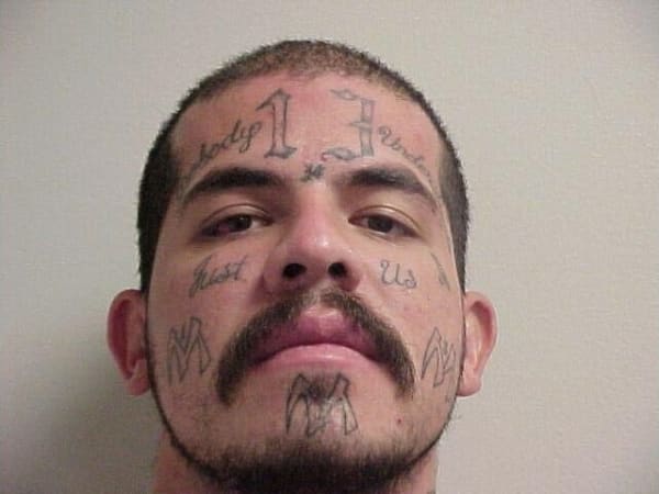 This facial tattoo displays the use of the number 13, which represents the letter "M," showing that this gang member is aligned with the Mexican Mafia.