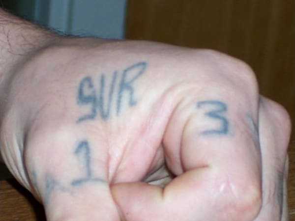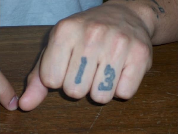 The 13 on this gang members fingers shows that he is a Sureño aligned with the Mexican Mafia. He could also be a member of La Eme affiliated gangs such as MS-13, Sur 13, and many others.