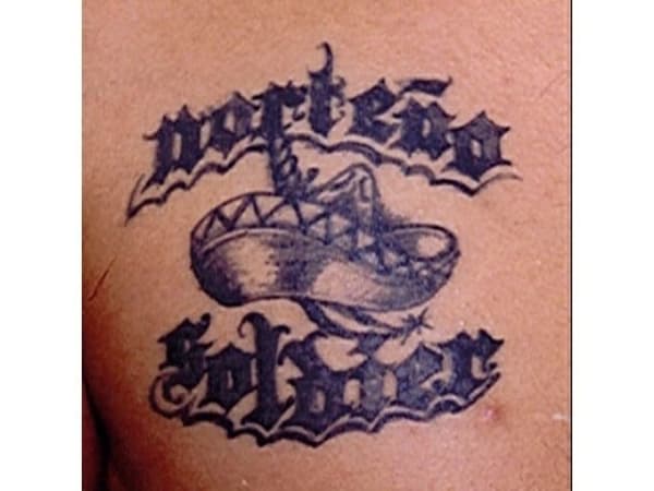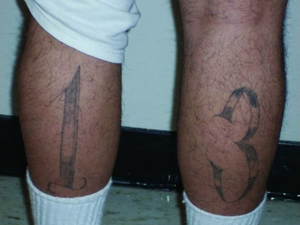 A Sureño tattoo on both calfs displays the use of the number 13.