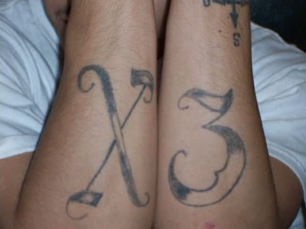 These Sureño tattoos display the use of the number 13 (in this case the Roman numeral for 10 with the Arabic number 3).