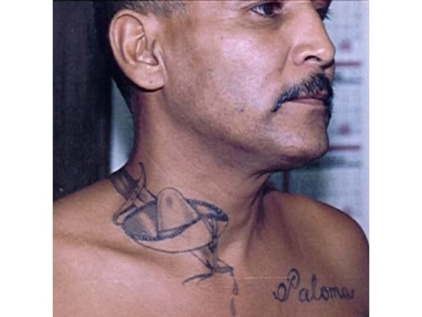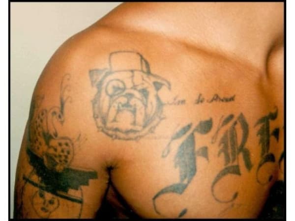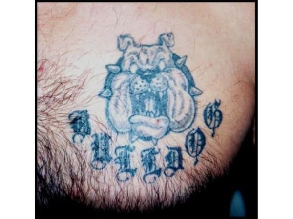 This pectoral tattoo identifies the wearer as a member of the Fresno Bulldog gang.