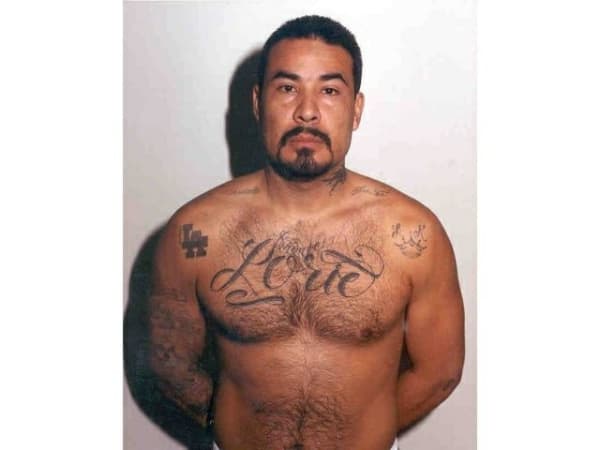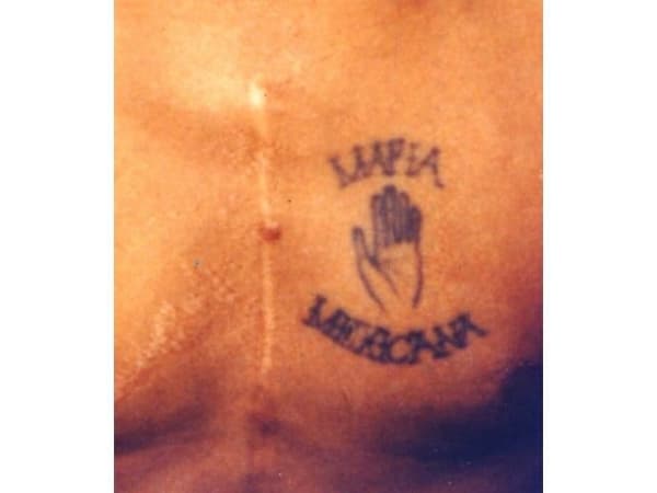 The Latin Kings are a large mostly-Hispanic gang that formed in the Chicago area. Latin Kings tend to use five-pointed crowns to identify themselves. The crown may be accompanied by the initials "LK," and often will have some sort of inflammatory symbolism aimed at an opposing gang. A lion or a lion wearing a crown with a variety of inscriptions may also be seen. This Latin King is also a member of the Mexican Mafia. It's not because he's a Dodger fan that he has "LA" on his right shoulder.