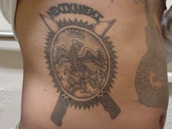 The Mexikanemi gang, represented in this tattoo, originally formed in the Texas Department of Corrections in the early-1980s. The gang’s ‘EMI’ symbol is often confused with the Mexican Mafia ‘EME’ symbolism. Mexikanemi means "Free-Mexican".