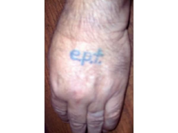 EPT is not a pregnancy test. At least not on this guy's hand. It stands for the "El Paso Tip," which formed in Texas before the Mexican Mafia. The 1940's Pachucos from Texas would tattoo "ept" or just "t" for "the Texas Tip." California pachucos used the tattoos "LA" for "Los Angeles" and "M" for "Maravilla" and later for "Mexican Mafia."