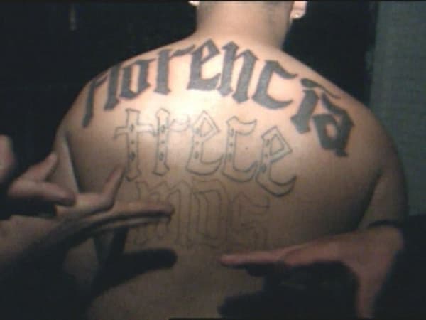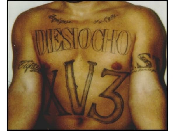 An 18th Street gang member's tattoo displaying "18" in Roman numerals and the Spanish word for that number, "dieseocho," spelled out prominently.