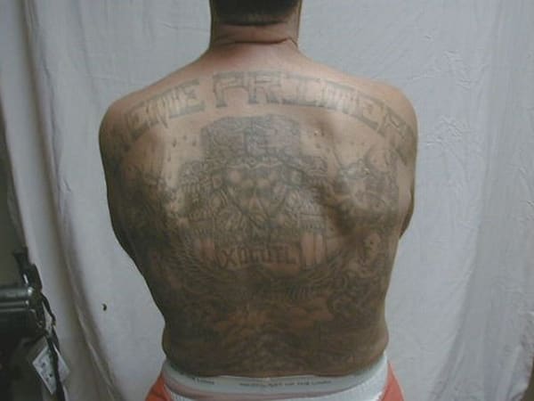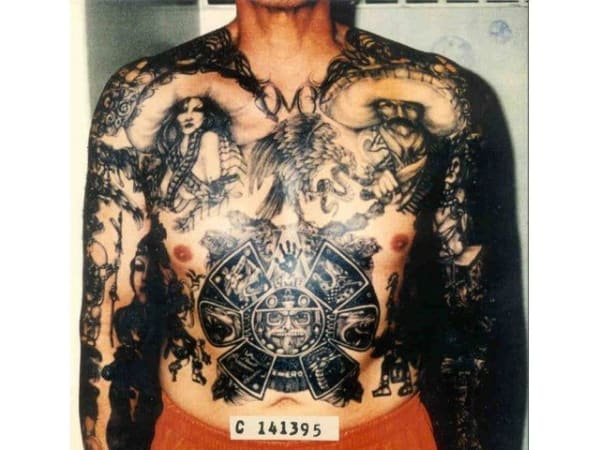 The elaborate tattoo of the Aztec calendar on this inmate is a common symbol on many Hispanic prisoners. Much more significant is the "M" just below his throat, which marks him as a member of "La Eme", the Mexican Mafia prison gang. Also note that the snake in the eagle's beak is in the shape of an "M."