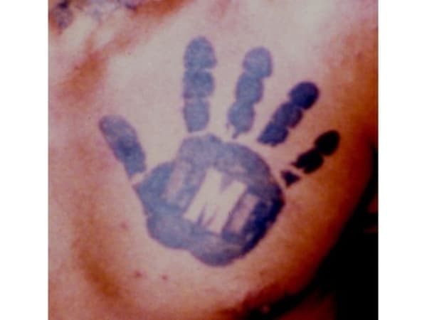 Another Mexican Mafia tattoo with an open hand referencing the "black hand of death." The scars on this inmate are from prison stabbings.