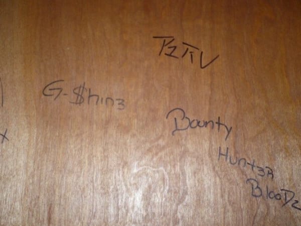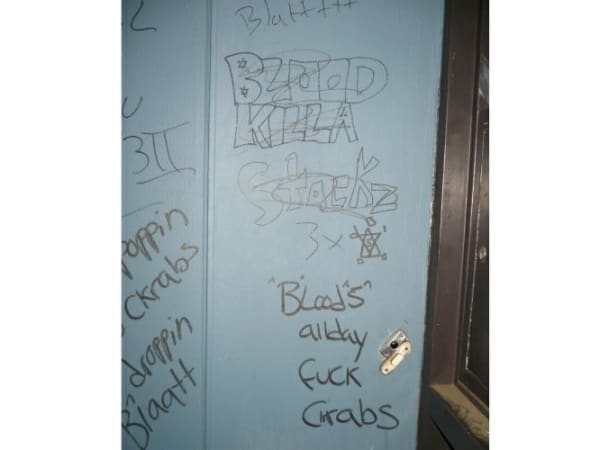 Drive-by shooting threats are often used, such as "5 poppin, 6 droppin." This one was found in the Fairhaven neighborhood of Chapin, South Carolina. It's a Blood set.