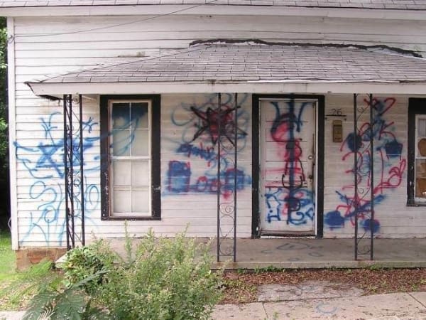 A slew of colorful tagging on a house in Salisbury, North Carolina.