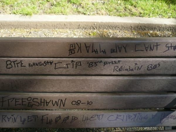 A slew of tagging is seen on a bench in Trowbridge Park (Mich.).