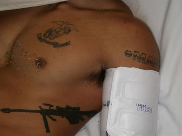 One of the marine suspects was a military trained sniper who sported a prominent tattoo of a .50-caliber Barrett rifle. The suspect was taken into custody when the K-9 bit his left arm.