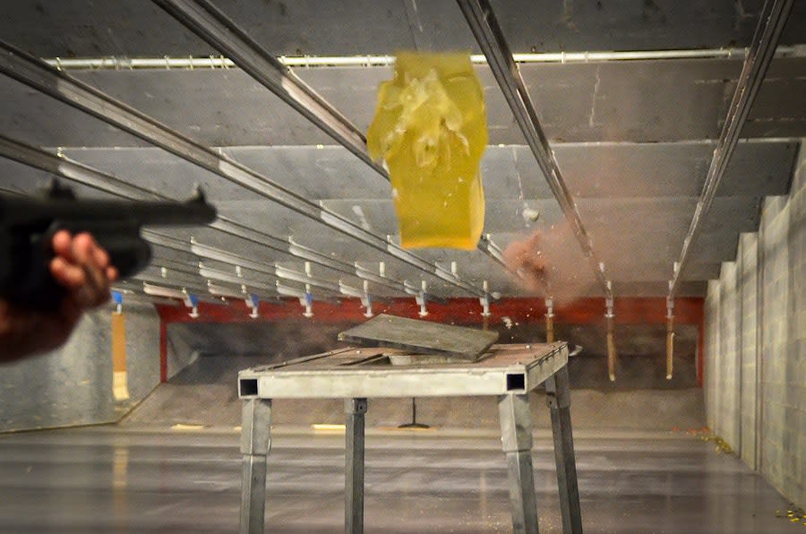 A frangible shotgun round being shot through gelatin mimics the effect on a human body. The cloud of dust can be seen behind the target.