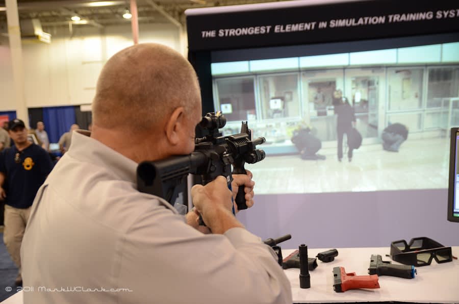 A vendor representative gives a demonstration with a training weapon.
