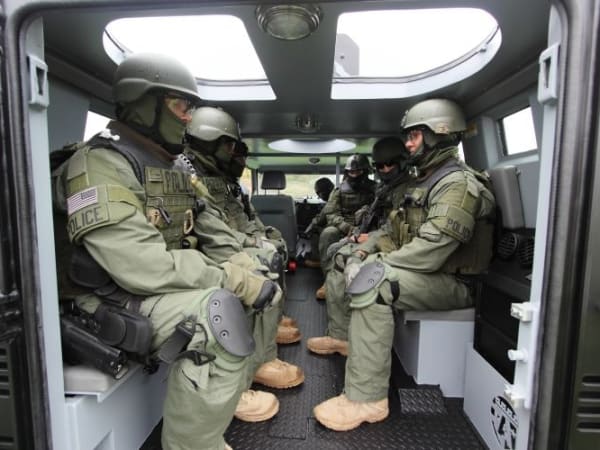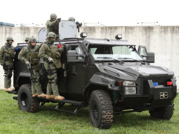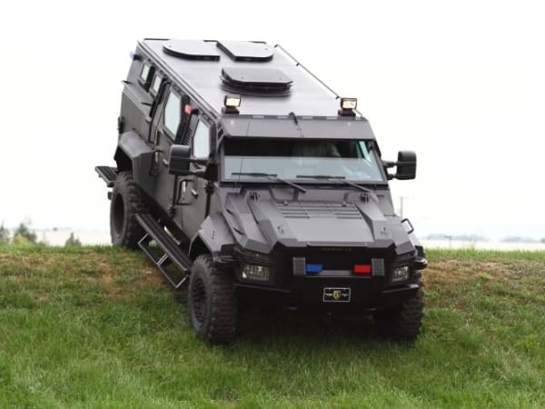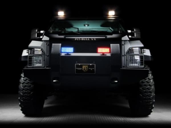 The Pit-bull VX from Alpine Armoring strikes an imposing stance, and may help violators rethink their barricaded position.