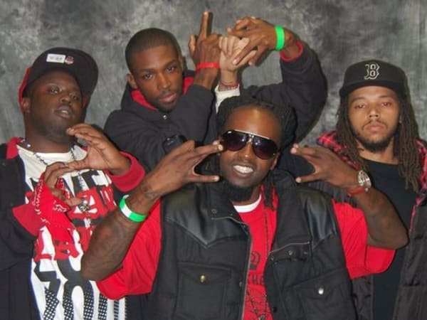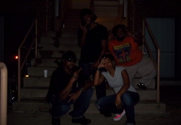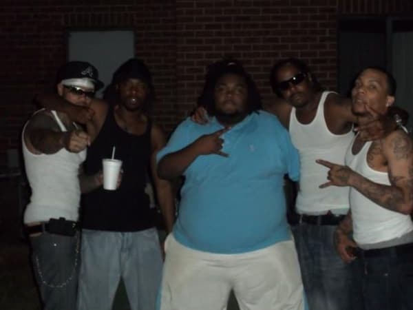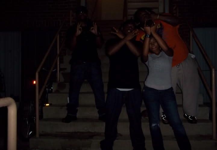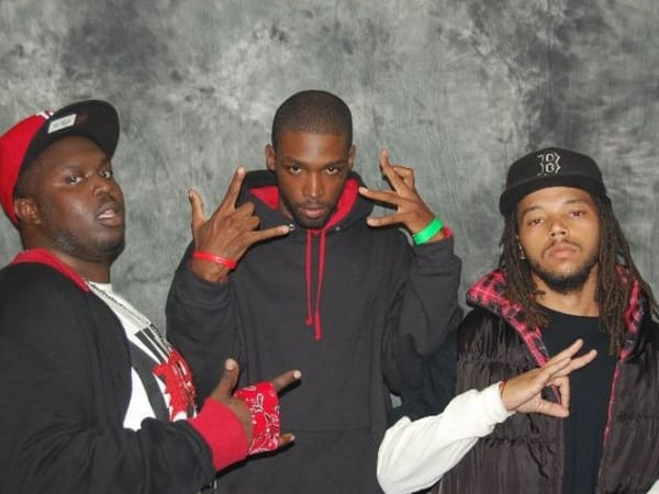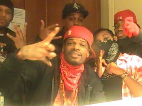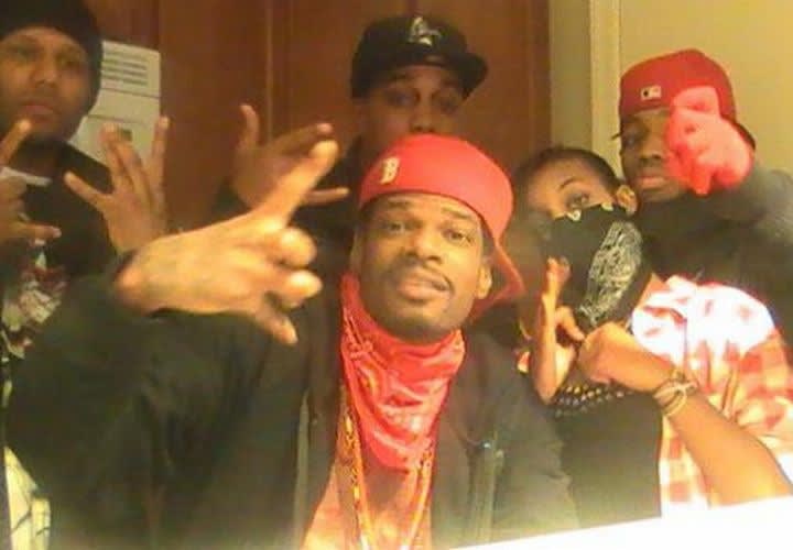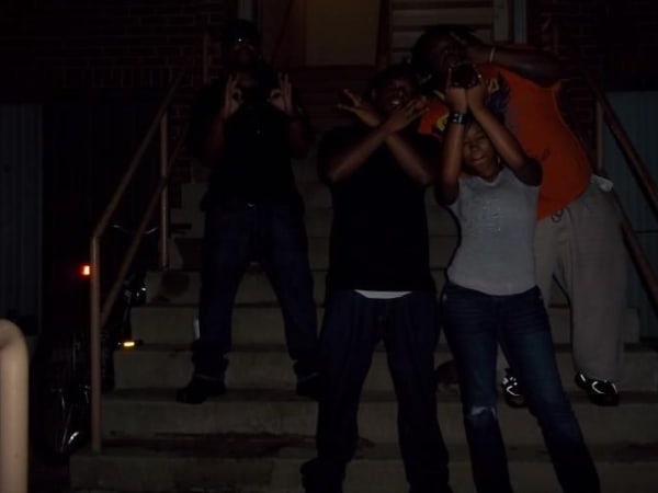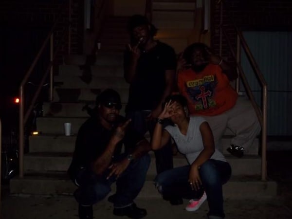 The suspected Blood on the left is showing "blood" with both hands. The other with his arms crossed is showing "westside." The female in gray is showing "brims are one."