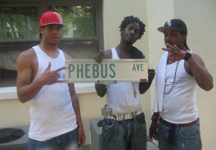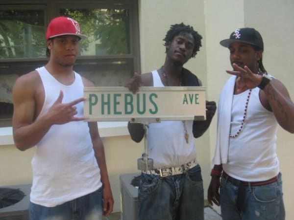 Three suspected Bloods (from l. to r.) show the hand sign for "westside" or "brims"; hold a street sign; and show the sign for "blood" or "piru."