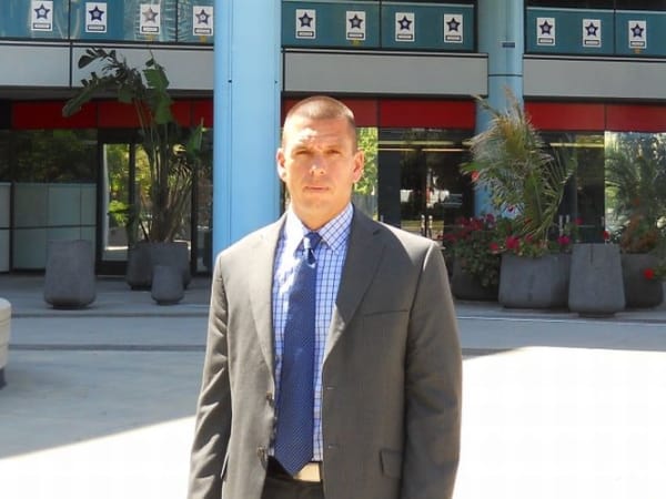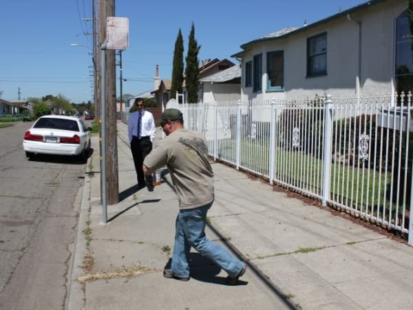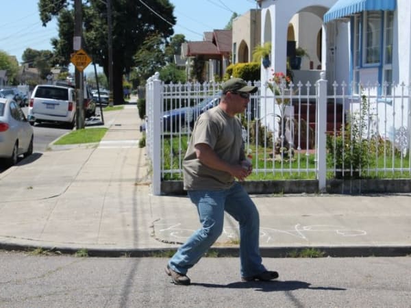 Officer Young demonstrates how he pursued Barrientos when he revisited the crime scene in April with POLICE Magazine. This view is east on Olive.