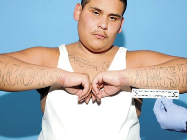Following his arrest, Barrientos showed off his forearm tattoos "DeCoto" and "Gangsta" to represent his Union City Norteno gang.