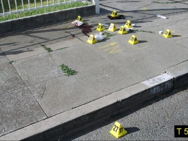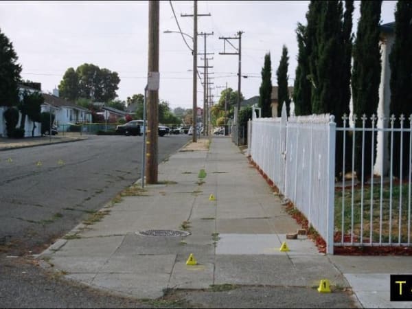 Spent casings from Officer Young and Barrientos' 9mm pistol were strewn along Olive. This view is east on Olive.