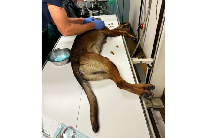 Los Angeles County Sheriff's K-9 Kjeld being treated for a gunshot wound.