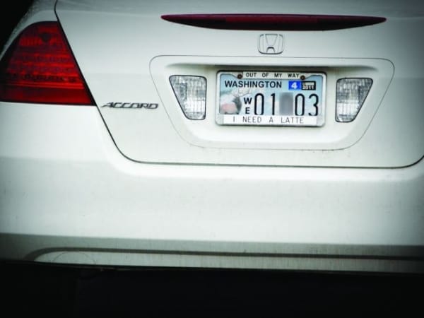 The driver of this car may need a latte, but he or she also needs a license plate frame that shows the type of affinity plate represented here. This one is for fans of elk in Washington.