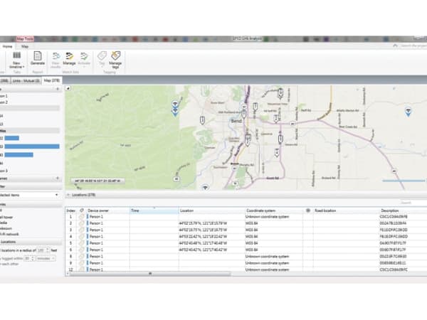 Trax software from Zetx recognizes cell phone data in any format from any provider and uses it to map the cell towers, create visuals of call information, highlight callers' habits, and even autofill search warrants. The software provides a visual of all of the call information from each tower. Trax communicates not just which tower was used and from which side of the tower the call came, but also calculates how far away from each tower a call might have been made. This can help pinpoint the location of a call that can be used to create an easily understood visual of callers' habits and pinpoint their location over time and on key dates.