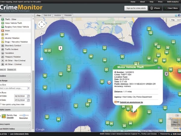 Spillman Analytics and CrimeMonitor from Spillman Technologies are tools developed to support intelligence-led policing initiatives. The Spillman Analytics module offers agencies a map-based analytics tool, helping them make informed decisions about their resources with multiple data layers and customizable time and date ranges. Spillman Analytics gives users the ability to create geographic profiles for quick access to specific areas for hotspot monitoring. CrimeMonitor allows public safety agencies to provide a community service through an easy-to-use online crime map and analytics dashboard, powered by BAIR Analytics.
