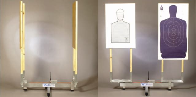 The TAC II from Elite Target Systems is a wireless, microprocessor controlled, compact, portable, and battery operated training/practice target system. It displays a pair of targets once or twice per execution with user-defined or random intervals for delayed start, first and second target display periods, and pause between displays. The 1,000-foot remote control range is ideal for sniper exercises, and any number of TAC II's can be synchronized for group activities. Routines are quick and easy to define, and up to 15 routines can be saved. The TAC II weighs 26 pounds, is stable in winds up to 30 mph, operates for days on a single charge, and collapses to 5x9x60 inches.
