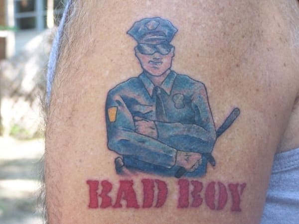 This officer's "Bad Boy" tattoo references Inner Circle's "Cops" theme song.