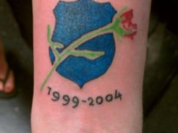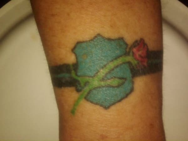 The "blue shield and rose" logo evokes a rose on a casket. The logo is used by the National Law Enforcement Officers Memorial Fund to honor fallen officers. This officer's tattoo also depicts the thin blue line of law enforcement.