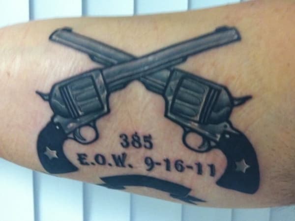 This officer's tattoo pays tribute to a fallen sergeant with two pistols, the date of the incident, and the sergeant's call sign (385).