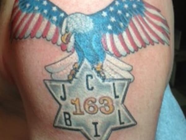 A patriotic eagle holds up a star with badge number (163). The officer included his children's initials on the star points.