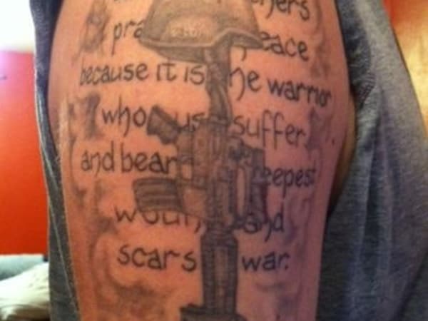 This Saint Michael tattoo also depicts the Gaelic phrase meaning "I'm my father's son." His father was an officer for 28 years.