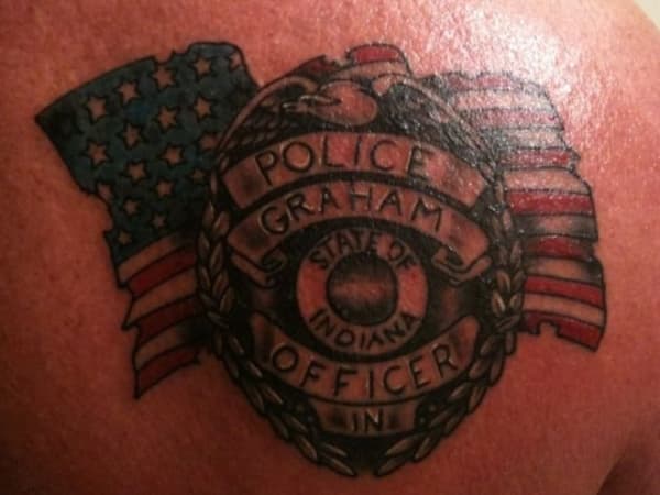 This Indiana detective's name (Graham) is shown on a badge with the backdrop of a tattered American flag.