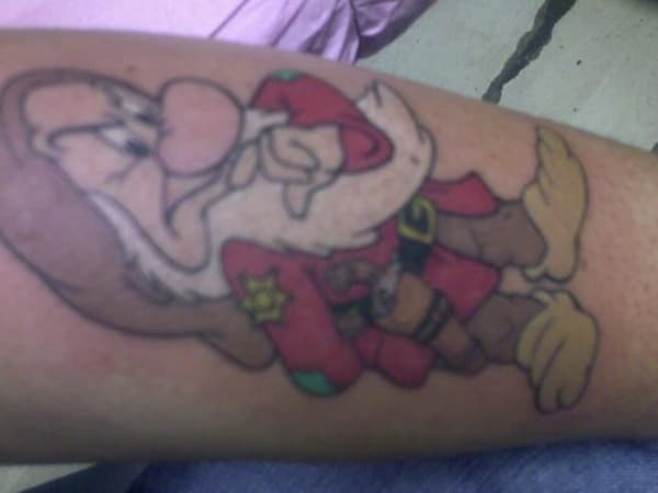 This tattoo depicts the officer's personality with Grumpy from Snow White and the Seven Dwarfs carrying a six shooter and tin star.