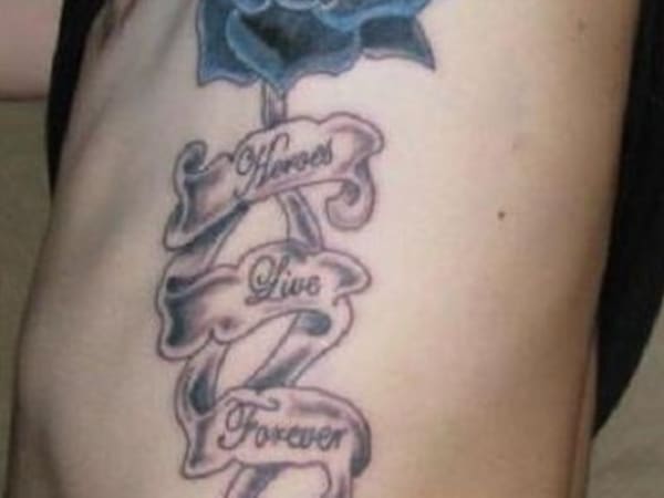 This tattoo also honors fallen officers with a blue rose for law enforcement and "Heroes Live Forever."