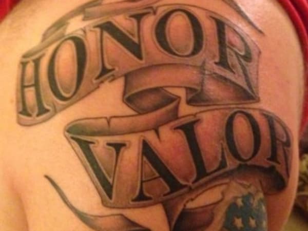The words "honor" and "valor" appear on scrolls above an American flag.