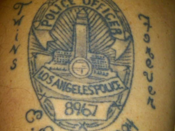 This officer's tattoo honors his fallen twin brother Duane "Duey" Johnson, an LAPD officer who was killed in a 1984 gunfight in Chinatown.