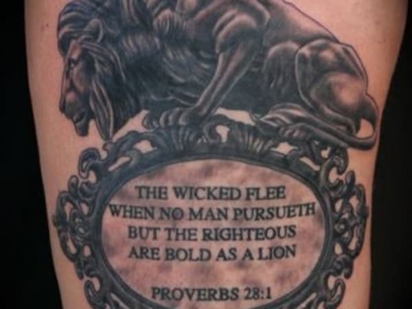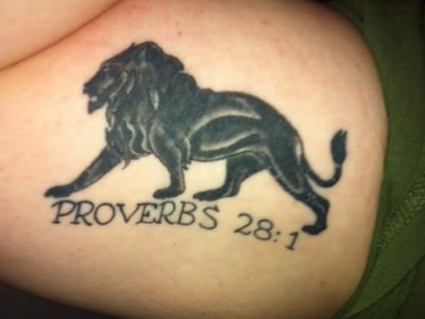 This memorial tattoo references Proverbs 28:1, "The wicked flee when no man pursueth, but the righteous are bold as a lion."