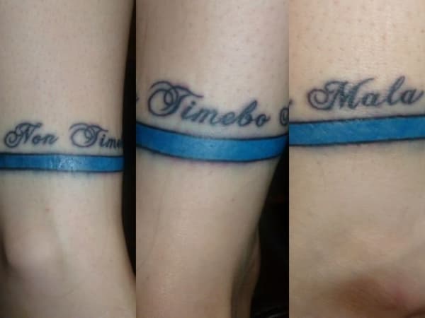 This female officer's ankle tattoo features the "thin blue line" motif with the Latin phrase, "Non Timebo Mala," meaning "I will fear no evil."