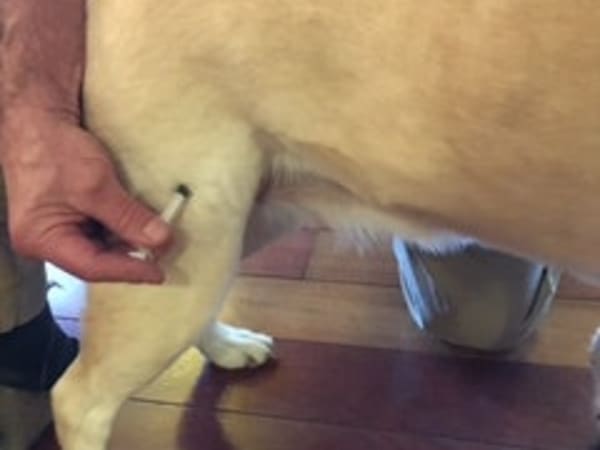 At a minimum, veterinarians recommend that K-9 handlers carry a first-aid kit, learn how to give injections, and know how to administer oxygen. A brief session with your veterinarian or even a vet tech should be sufficient to learn how to correctly give injections. Here are some photos to illustrate proper first-aid techniques.