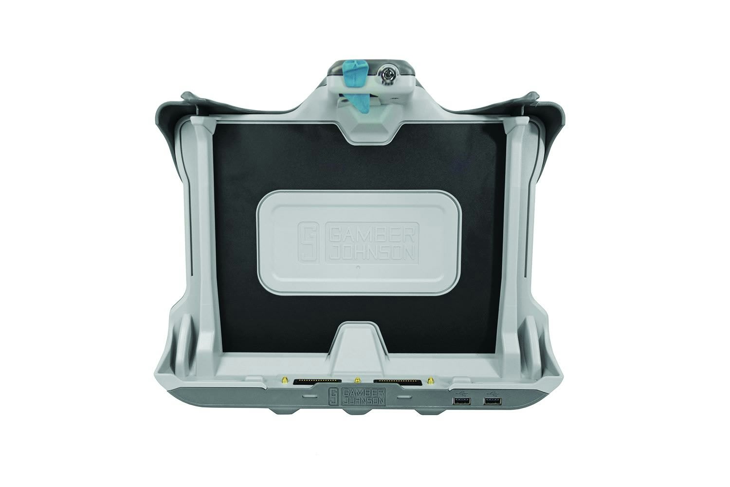 Gamber-Johnson's K120 Tablet Docking Station for the Getac K120 fully rugged tablet offers an easy-to-use latching system allowing users to dock or release their K120 device effortlessly with only one hand. The docking station features a variety of ports (including front-facing fast-charging USB ports) to connect any mobile office peripheral device. In addition, Gamber-Johnson's K120 docking station can also accommodate Getac's hard handle, rotating hand strap, and high-capacity battery accessories so you never have to compromise. www.gamberjohnson.com