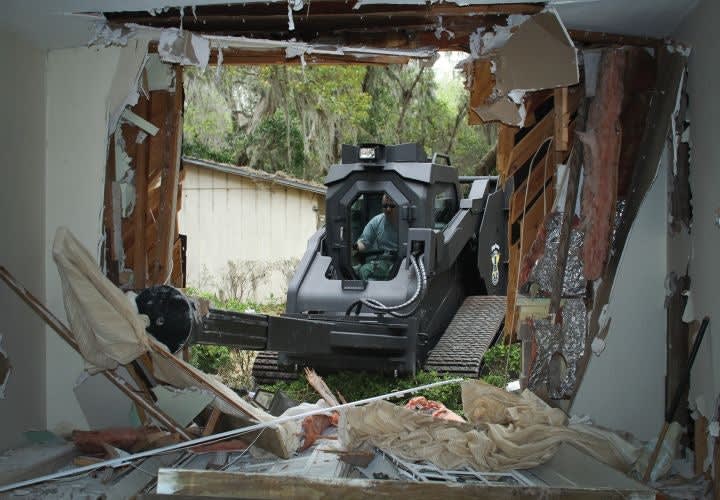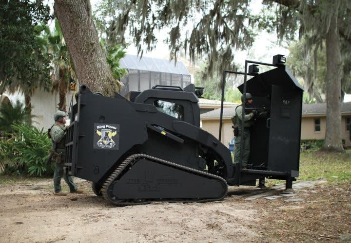 Ring Power's The Rook offers law enforcement agencies a versatile, tracked tactical vehicle with ballistic armoring rated to stop Level IV threats including armor-piercing rifle rounds. The Rook includes an armored deployment platform, hydrailic breaching ram, vehicle extraction tool, grapple claw, and 25-foot gooseneck trailer. The vehicle retails for $250,000. Photos courtesy of Ring Power.