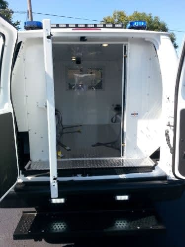This view shows the rear doors open and the rear step officers use to help arrestees into the van.