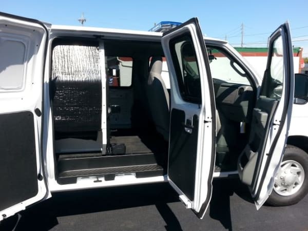 This view of the passenger side with three doors open shows access into passenger compartment storage area.