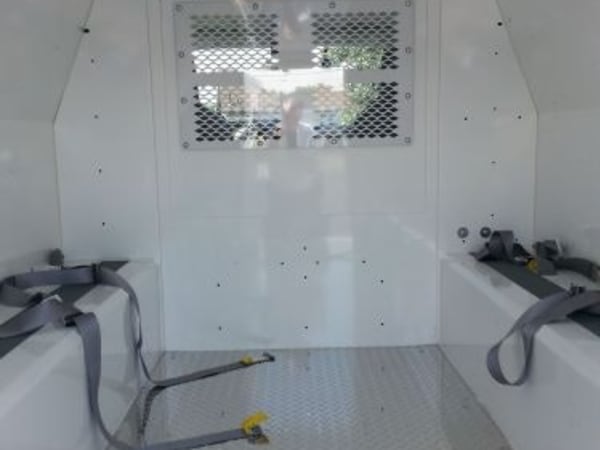 This view shows the rear outside doors open and the cage door officers use to secure prisoners.