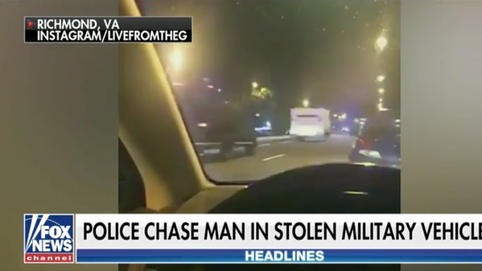 Soldier Steals Armored Vehicle Leads Virginia Officers on 60-Mile Chase