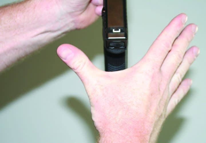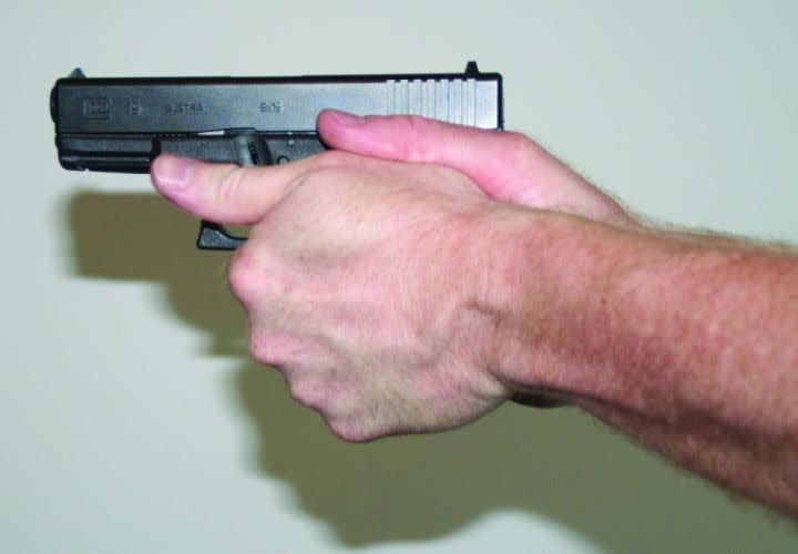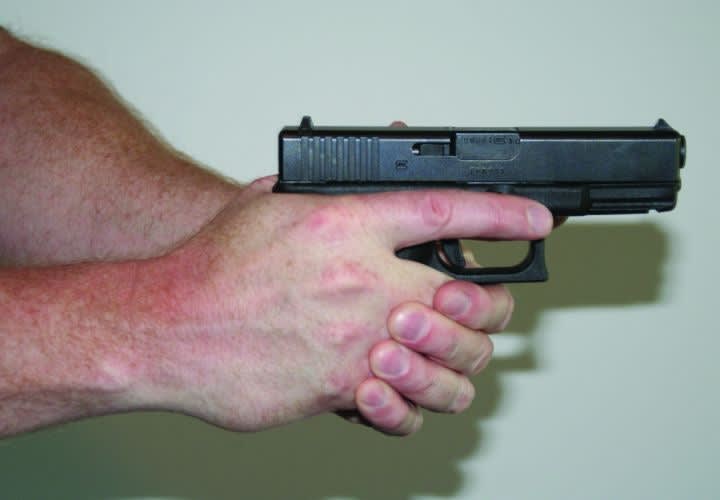 Having a firm grip on your semi-automatic handgun is key for several reasons, the most important of which is to avoid what's commonly called "limp wristing" the gun. When a shooter has a weak or loose grip on the gun, it usually results in the firearm not cycling properly, causing the gun to jam. A firm grip will also help you on assignments, where you need to fire from a marine platform. Read "Perfecting Your Handgun Grip" for more. Photos courtesy of Michael Rayburn.