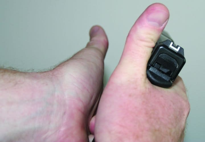 By placing your thumbs along the side of the pistol's slide, you are able to obtain that all important tight, convulsive grip equally with both hands. Squeeze both hands together as hard as you can.
