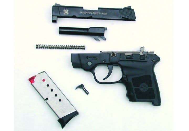 The Smith & Wesson Bodyguard 380 was designed for use by police officers and licensed civilians who needed a small, lightweight, concealable and easy to use pistol. It's polymer frame is reinforced with a steel insert that contains the trigger mechanism and the rails that the slide reciprocates on. The pistol weighs a mere 11.85 ounces. View our photos showing the details of this new backup gun (including a disassembly view), and then read our Arsenal review, " Smith & Wesson Bodyguard 380 Pistol ."